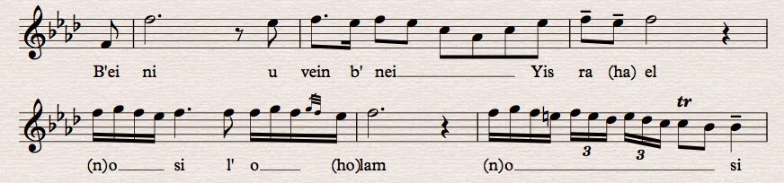 On the words “Beini uvein b’nei Yisrael os-hi l’olam,” Ganchoff first sings a modal motif, jumping the octave vacillating between the upper tonic and the b7 below, and then down and up on a controlled arpeggio on a minor 7th chord with lightly aspirated accents. Ganchoff repeats the words “Beini uvein,” elaborating on the upper ^8-^b7 motif adding the 9th above the octave twice and then the third time singing a major ^7, descending in the equivalent Ahava Raba mode.
