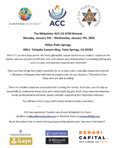 Midwinter Retreat 2026 NameThis field is for validation purposes and should be left unchanged.First Name(Required)Last Name(Required)Email(Required) Address(Required) Street Address City State / Province / Region ZIP / Postal Code AfghanistanAlbaniaAlgeriaAmerican SamoaAndorraAngolaAnguillaAntarcticaAntigua and BarbudaArgentinaArmeniaArubaAustraliaAustriaAzerbaijanBahamasBahrainBangladeshBarbadosBelarusBelgiumBelizeBeninBermudaBhutanBoliviaBonaire, Sint Eustatius and SabaBosnia and HerzegovinaBotswanaBouvet IslandBrazilBritish Indian Ocean TerritoryBrunei DarussalamBulgariaBurkina FasoBurundiCabo VerdeCambodiaCameroonCanadaCayman IslandsCentral African RepublicChadChileChinaChristmas IslandCocos IslandsColombiaComorosCongoCongo, Democratic Republic of theCook IslandsCosta RicaCroatiaCubaCuraçaoCyprusCzechiaCôte d'IvoireDenmarkDjiboutiDominicaDominican RepublicEcuadorEgyptEl SalvadorEquatorial GuineaEritreaEstoniaEswatiniEthiopiaFalkland IslandsFaroe IslandsFijiFinlandFranceFrench GuianaFrench PolynesiaFrench Southern TerritoriesGabonGambiaGeorgiaGermanyGhanaGibraltarGreeceGreenlandGrenadaGuadeloupeGuamGuatemalaGuernseyGuineaGuinea-BissauGuyanaHaitiHeard Island and McDonald IslandsHoly SeeHondurasHong KongHungaryIcelandIndiaIndonesiaIranIraqIrelandIsle of ManIsraelItalyJamaicaJapanJerseyJordanKazakhstanKenyaKiribatiKorea, Democratic People's Republic ofKorea, Republic ofKuwaitKyrgyzstanLao People's Democratic RepublicLatviaLebanonLesothoLiberiaLibyaLiechtensteinLithuaniaLuxembourgMacaoMadagascarMalawiMalaysiaMaldivesMaliMaltaMarshall IslandsMartiniqueMauritaniaMauritiusMayotteMexicoMicronesiaMoldovaMonacoMongoliaMontenegroMontserratMoroccoMozambiqueMyanmarNamibiaNauruNepalNetherlandsNew CaledoniaNew ZealandNicaraguaNigerNigeriaNiueNorfolk IslandNorth MacedoniaNorthern Mariana IslandsNorwayOmanPakistanPalauPalestine, State ofPanamaPapua New GuineaParaguayPeruPhilippinesPitcairnPolandPortugalPuerto RicoQatarRomaniaRussian FederationRwandaRéunionSaint BarthélemySaint Helena, Ascension and Tristan da CunhaSaint Kitts and NevisSaint LuciaSaint MartinSaint Pierre and MiquelonSaint Vincent and the GrenadinesSamoaSan MarinoSao Tome and PrincipeSaudi ArabiaSenegalSerbiaSeychellesSierra LeoneSingaporeSint MaartenSlovakiaSloveniaSolomon IslandsSomaliaSouth AfricaSouth Georgia and the South Sandwich IslandsSouth SudanSpainSri LankaSudanSurinameSvalbard and Jan MayenSwedenSwitzerlandSyria Arab RepublicTaiwanTajikistanTanzania, the United Republic ofThailandTimor-LesteTogoTokelauTongaTrinidad and TobagoTunisiaTurkmenistanTurks and Caicos IslandsTuvaluTürkiyeUS Minor Outlying IslandsUgandaUkraineUnited Arab EmiratesUnited KingdomUnited StatesUruguayUzbekistanVanuatuVenezuelaViet NamVirgin Islands, BritishVirgin Islands, U.S.Wallis and FutunaWestern SaharaYemenZambiaZimbabweÅland Islands Country I will attend:(Required)Check all boxes that apply. Select All Monday, January 5 Tuesday, January 6 Wednesday, January 7 I’d like to volunteer to:Check all that apply. Lead tefillot Share new music Other Preferred PronounThey/them/theirsShe/her/hersHe/him/hisZe/hir/hirsAdditional Questions or Comments: