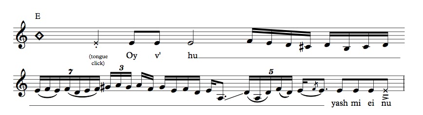 The second is on the word "uv'nei." Grammarians will balk at Oysher's pronouncing the sh'va under the letter vet, insisting that it is a sh'va m'rakhef, not a sh'va na! Too bad. Oysher can pronounce it as he likes! And besides, it's a nice riff.Rounding out the album is "Shema Yisroel" from the Musaf Kedusha. Beginning with a choral rendition of the Sh'ma, the piece continues with a sort of call and response with the choir lyrically singing "Hu Eloheinu" and Oysher echoing in cantorial fashion. The strings then hold out an E chord over which Oysher sings the following low, serpentine lick: