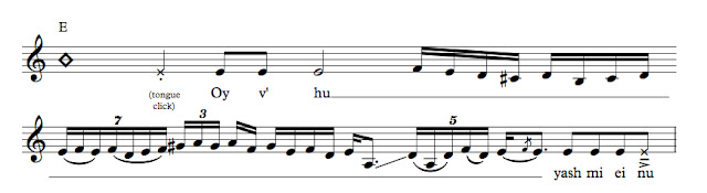 I transcribed two cantorial runs from this piece that I particularly like. At the conclusion of the first, on the words "binyan olam," you'll notice he does not exactly say "olam" or even "oylom," but adds some additional consonant sounds which accentuate the musical embellishments, rendering it something like "o'w'hoy'lom." My Hebrew professor is pulling her hair out, but Cantor Mendelson exclaims "Mommy!"
